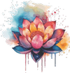 A watercolor painting of a pink lotus flower with green and yellow accents around the petals.